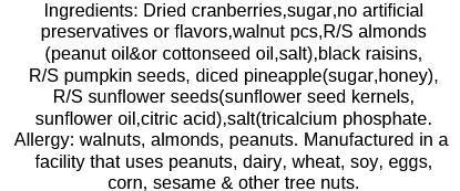 Dried cranberries, walnuts, almonds, raisins, pumpkin seeds, dried pineapple, & sunflower seeds.